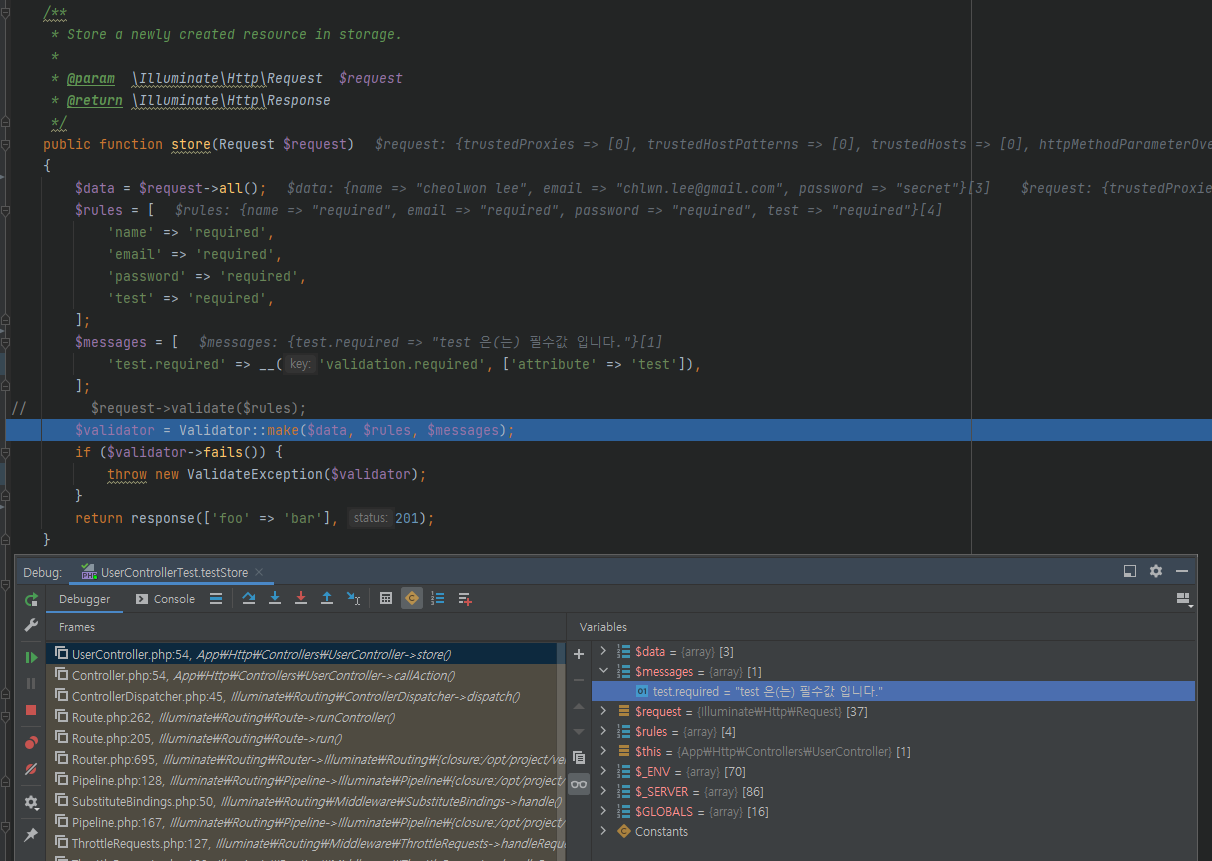 Laravel 을 최초 설치하면 resources/lang/en 경로에 auth, pagination, passwords, validation 4개 항목에 대한 기본 메시지들이 이미 정의되어있고 이 장에서는 해당 메시지를 ko 로 그대로 복사하고 필요한 메시지를 번역해 테스트 해보기로 한다.# resources/lang/ko/validation.php return [ ... 'required' => ':attribute 은(는) 필수값 입니다.', ... ]; # 복사된 한국어 메시지중 'required' 라는 키의 메시지를 상기와 같이 수정했다.