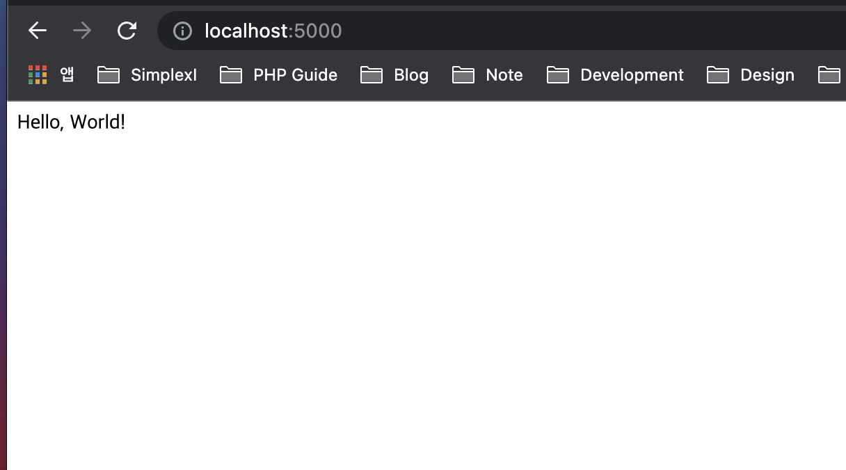 브라우저를 통해 http://127.0.0.1:5000 포트를 접근하고 Hello, World 페이지가 표기된다면 정상 실행된 것입니다.