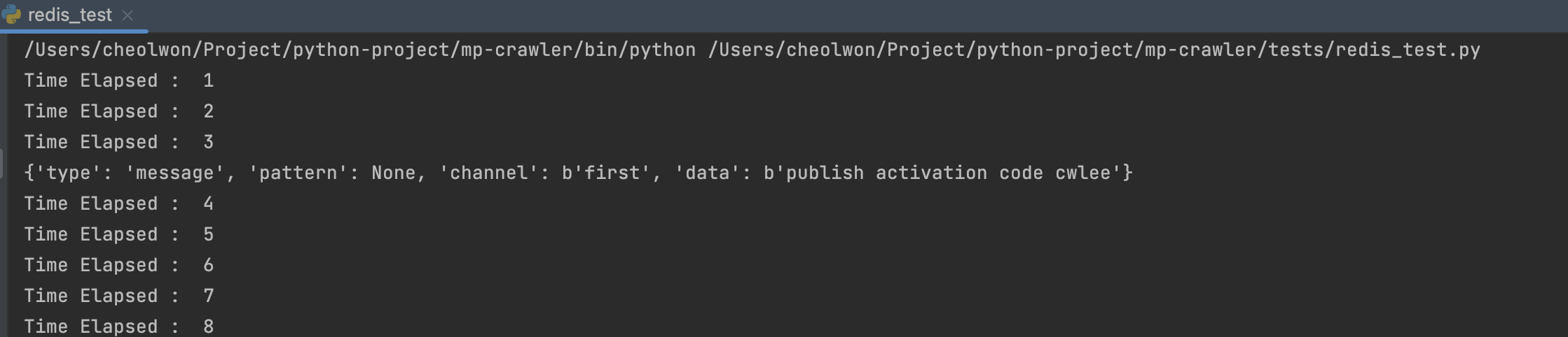 테스트를 위해 redis-cli 를 통헤 메시지를 발행(Publish) 한다.